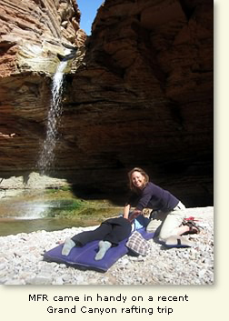 I had been exposed to Myofascial Release as an OT student, but it wasn’t until hitting the proverbial “rock bottom” that I finally found an MFR therapist in Denver. My body immediately responded and knew this was what it needed. I traveled to John Barnes’ clinic in Sedona, Arizona to undergo two weeks of intensive therapy. In addition to receiving excellent treatment, I was introduced to the concept of treating myself and the principles of Myofascial Stretching. Returning home with less pain than I’d had in years, I continued to receive therapy and began taking MFR Seminars. A tremendous amount of my energy went into Myofascial Stretching. Hours were spent alone tuning into my body discovering where my fascial restrictions were and how to release them. I experimented with techniques learned in Sedona, and intuitively started to develop my own. Upon learning to feel the releases, Myofascial Stretching became a part of my lifestyle as I gratefully returned to previous activities. I could now release tight tissue while watching a movie, riding in the car or on my bike, dancing at a concert and engaging in conversation at a party. Props such as trees and logs, chairlift supports, doorways, rocks, benches and picnic tables helped me to engage and release fascial restrictions. I stretched while talking on the phone, waiting in line, typing at the computer and even sitting on the toilet. Increased body awareness, greater focus, presence and ability to concentrate on two things at once were unexpected and welcomed benefits of this process.
